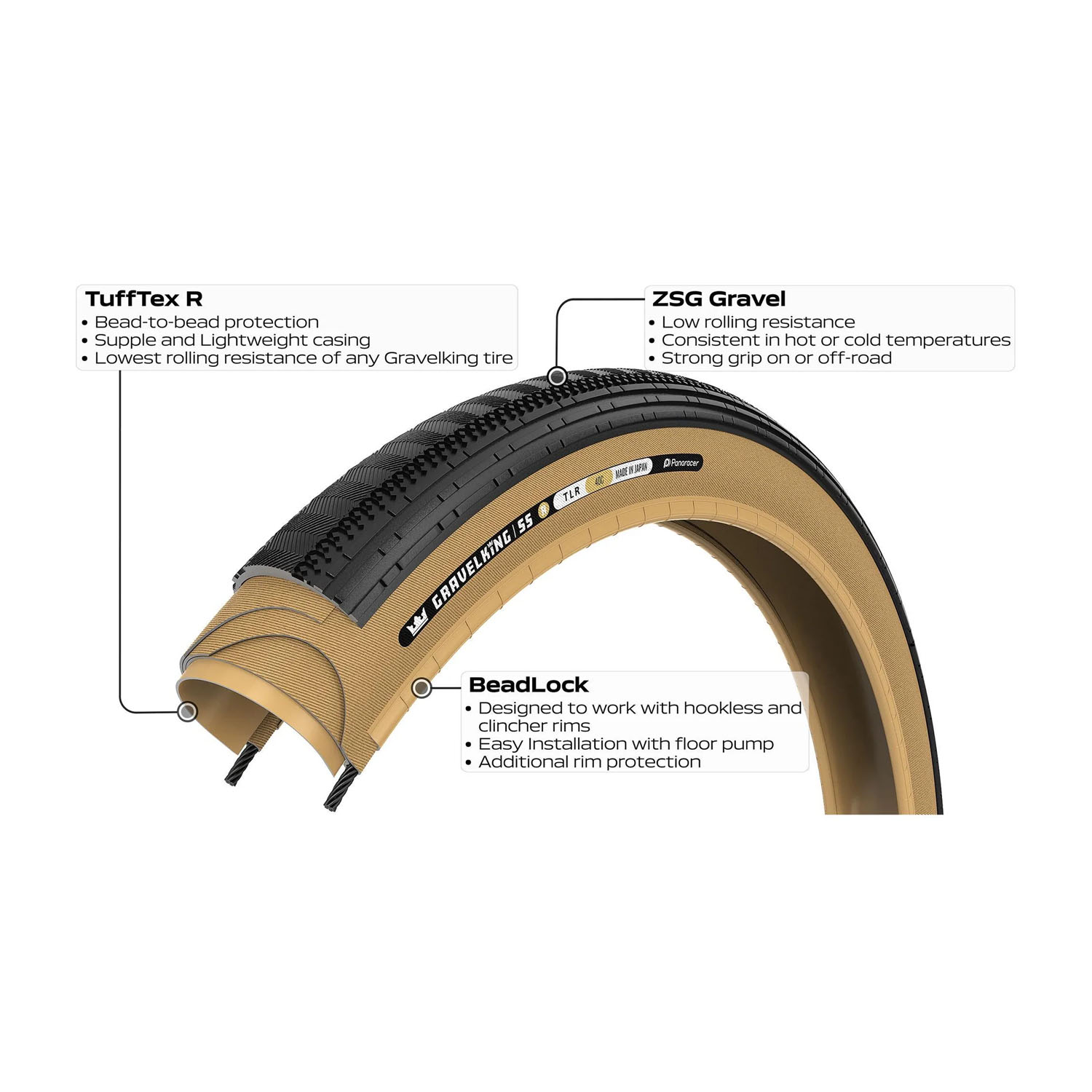 De vertrouwde ZSG Gravel Compound zorgt voor een lage rolweerstand zonder in te leveren op slijtvastheid en grip. In combinatie met de nieuwe BeadLock technologie is de band eenvoudig tubeless te monteren en blijft hij veilig op zijn plek, zowel op hookless als traditionele clincher velgen. Dit vergroot de inzetbaarheid en maakt de SS-R geschikt voor moderne gravelwielen.