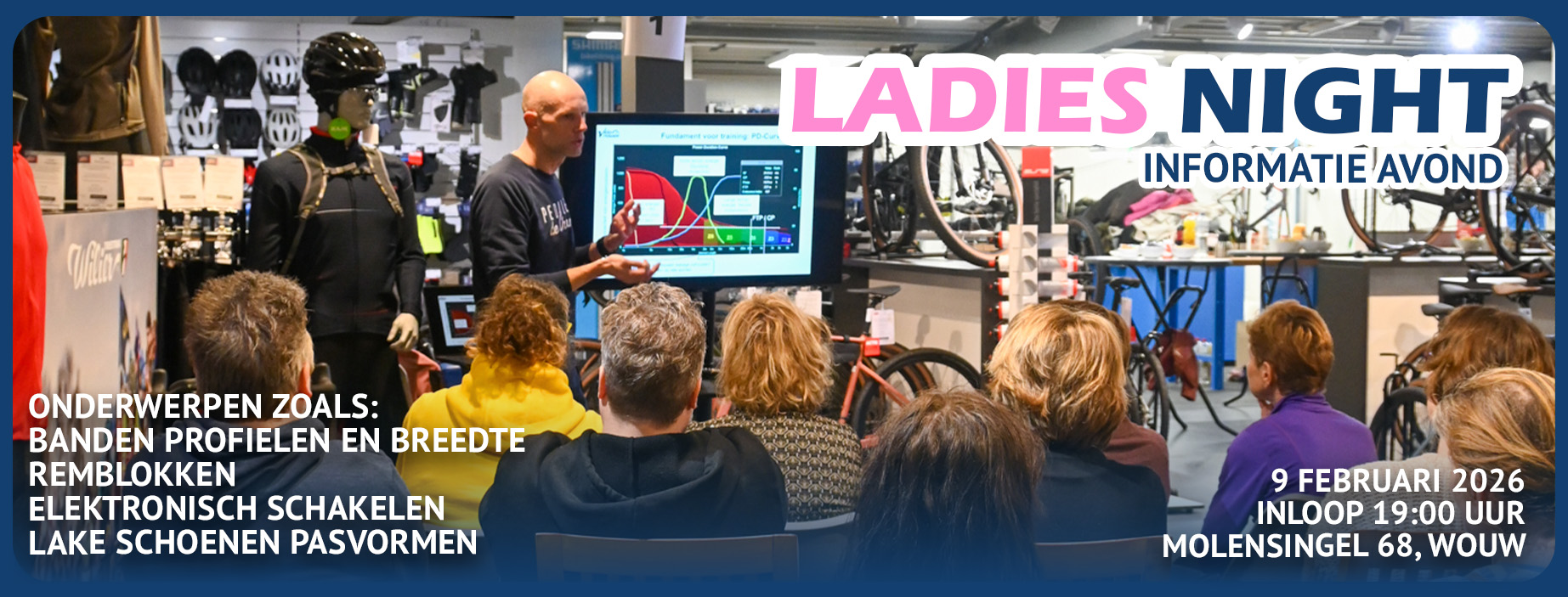 Tijdens de Ladies Night geven verschillende experts uitleg over herkenbare onderwerpen binnen het sportieve fietsen. Je leert meer over onderdelen, onderhoud en slimme techniek, zodat je met nog meer vertrouwen op pad gaat.