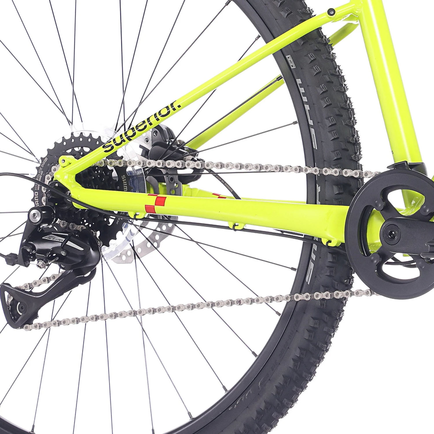 De Shimano 1x8 aandrijving met een Shimano Altus achterderailleur en een cassette met een bereik van 11-34 tanden maakt schakelen eenvoudig en overzichtelijk. Dit helpt jonge rijders om zich te focussen op het fietsen zelf. De Shimano MT200 hydraulische schijfremmen met 160 mm rotors voor en achter zorgen voor consistente remkracht onder verschillende omstandigheden, wat bijdraagt aan veiligheid en controle.