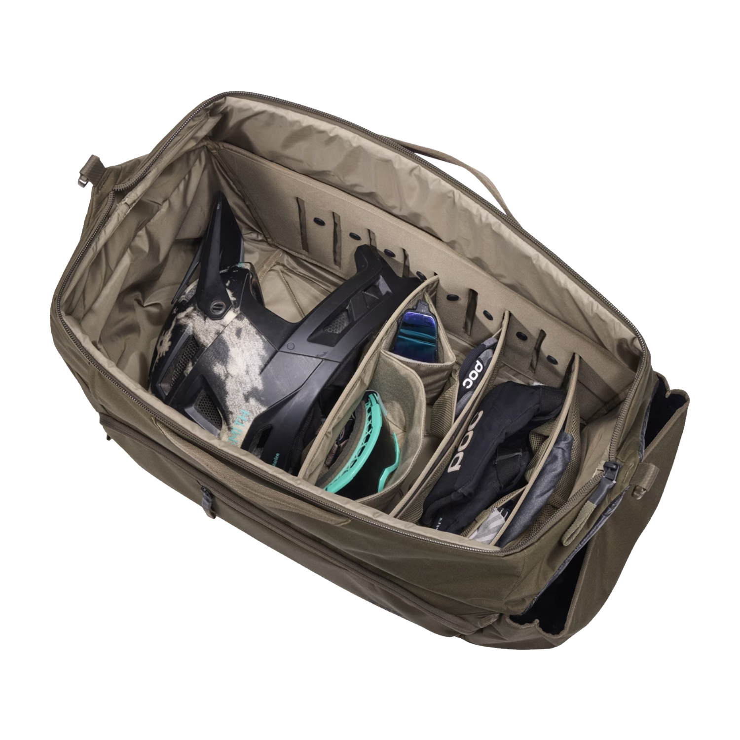 De Thule RoundTrip MTB Duffel is uitgerust met een volledig verwijderbaar en aanpasbaar verdeelsysteem. Hiermee stel je de indeling precies af op jouw uitrusting, van complete kits tot losse accessoires. Speciale panelen beschermen mountainbikebrillen en wrap-around fietsbrillen, terwijl afgesloten paneelzakken kleine onderdelen netjes bij elkaar houden.